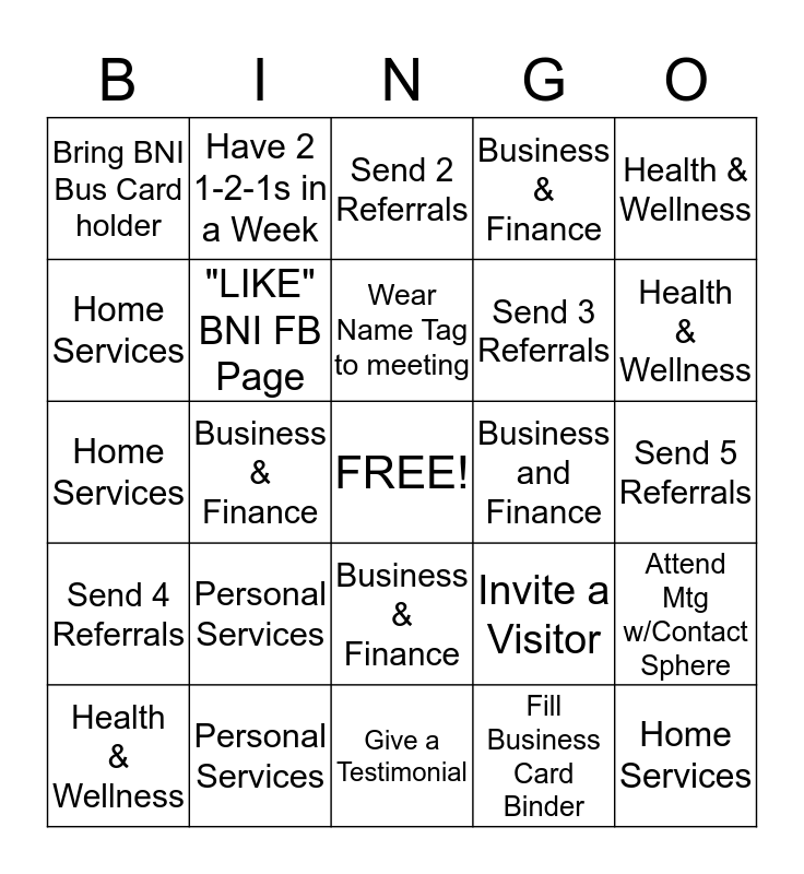 This bingo card has a free space and 27 words: Invite a Visitor, Complete a 1-2-1, Send 3 Referrals, Give a Testimonial, Home Services, Send 2 Referrals, Have 2 1-2-1s in a Week, Send 4 Referrals, Business and Finance, Attend Mtg w/Contact Sphere, Home Services, Business & Finance, Health & Wellness, Personal Services, Health & Wellness, Complete a 1-2-1, "LIKE" BNI FB Page, Wear Name Tag to meeting, Personal Services, Bring BNI Bus Card holder, Send 5 Referrals, Fill Business Card Binder, Business & Finance, Home Services, Business & Finance, Health & Wellness and Personal Services.