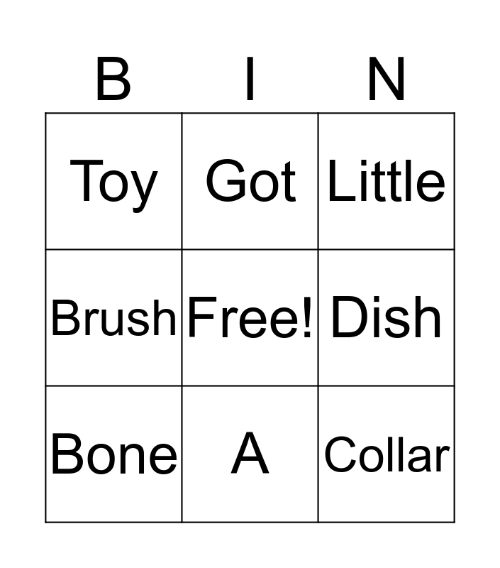 This bingo card has a free space and 12 words: I, Blanket, Collar, Dish, Got, Little, A, Bed, Toy, Brush, Bone and Puppy.
