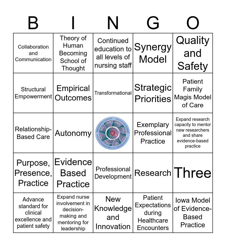 This bingo card has a free space and 29 words: Advance standard for clinical excellence and patient safety, Advocacy and Influence, Autonomy, Care, Concern, Respect, Cooperation, Collaboration and Communication, Continued education to all levels of nursing staff, Empirical Outcomes, Evidence Based Practice, Exemplary Professional Practice, Expand nurse involvement in decision-making and mentoring for leadership, Expand research capacity to mentor new researchers and share evidence-based practice, Iowa Model of Evidence-Based Practice, New Knowledge and Innovation, Patient Expectations during Healthcare Encounters, Patient Family Magis Model of Care, Patients, Family, and Community, Professional Development, Purpose, Presence, Practice, Quality and Safety, Relationship-Based Care, Research, Shared Governance, Strategic Priorities, Structural Empowerment, Synergy Model, Theory of Human Becoming School of Thought, Three, Transformational and Transformational Leadership.