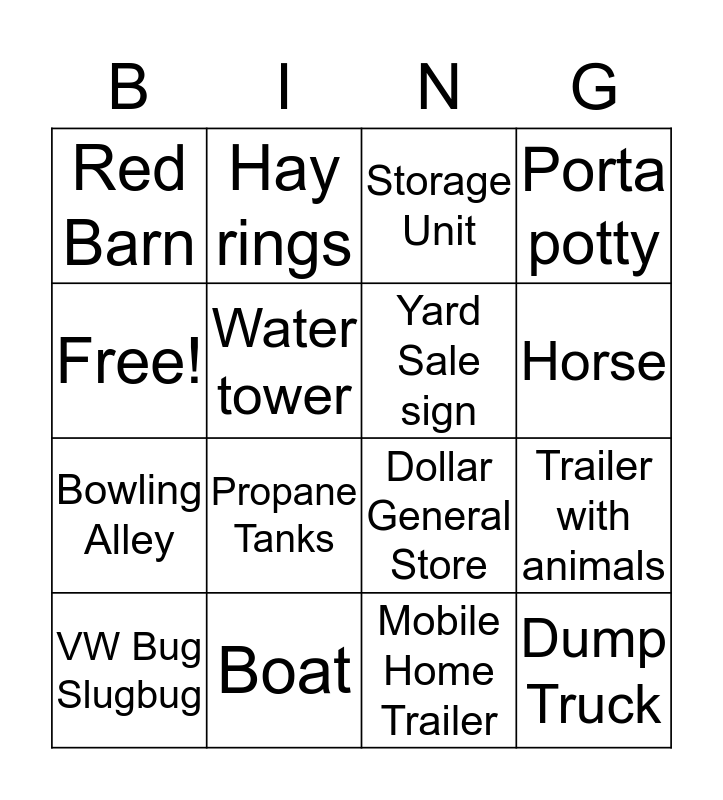 This bingo card has 16 words: Boat, Trailer with animals, Storage Unit, Red Barn, Bowling Alley, Hay rings, Dollar General Store, Mobile Home Trailer, Free!, Water tower, VW Bug Slugbug, Porta potty, Propane Tanks, Horse, Yard Sale sign and Dump Truck.