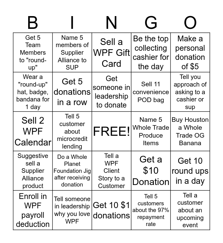 This bingo card has a free space and 24 words: Do a Whole Planet Foundation Jig after receiving donation, Tell someone in leadership why you love WPF, Get someone in leadership to donate, Enroll in WPF payroll deduction, Make a personal donation of $5, Get 5 Team Members to "round-up", Wear a "round-up" hat, badge, bandana for 1 day, Name 5 members of Supplier Alliance to SUP, Name 5 Whole Trade Produce Items, Tell a WPF Client Story to a Customer, Sell 11 convenience POD bag, Sell 2 WPF Calendar, Get a $10 Donation, Get 10 round ups in a day, Get 5 donations in a row, Tell 5 customers about the 97% repayment rate, Buy Houston a Whole Trade OG Banana, Sell a WPF Gift Card, Tell you approach of asking to a cashier or sup, Tell 5 customer about microcredit lending, Tell a customer about an upcoming event, Suggestive sell a Supplier Alliance product, Be the top collecting cashier for the day and Get 10 $1 donations.