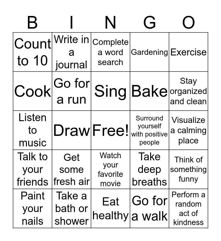 This bingo card has a free space and 33 words: Read, Color, Draw, Talk to a family member, Talk to your friends, Go for a run, Exercise, Paint your nails, Write in a journal, Dance, Sing, Complete a word search, Get enough sleep, Practice your spirituality, Surround yourself with positive people, Stay organized and clean, Take a bath or shower, Listen to music, Get some fresh air, Take deep breaths, Watch your favorite movie, Laugh, Count to 10, Visualize a calming place, Eat healthy, Perform a random act of kindness, Gardening, Bake, Cook, Think of something funny, Pet an animal, Go for a walk and Squeeze a stress ball.