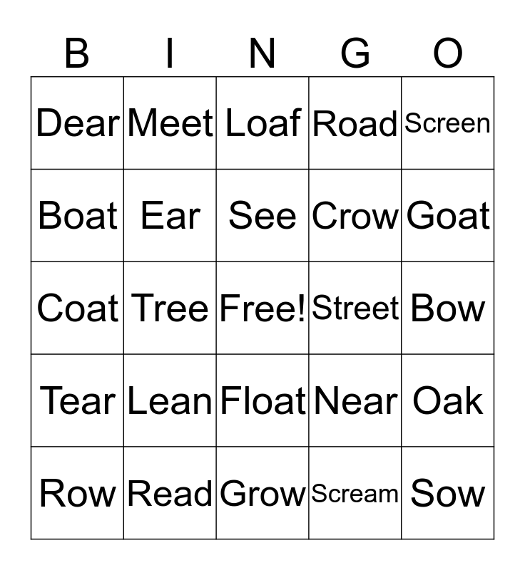 This bingo card has a free space and 24 words: Lean, Read, See, Row, Screen, Dear, Boat, Meet, Street, Float, Crow, Coat, Near, Oak, Ear, Scream, Bow, Loaf, Goat, Tree, Sow, Tear, Road and Grow.