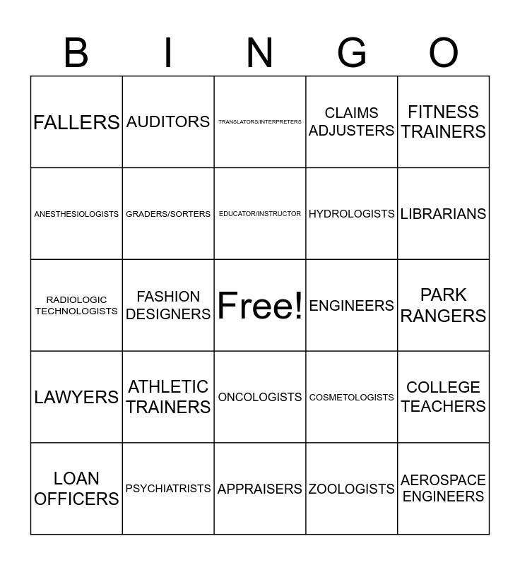 This bingo card has a free space and 47 words: ACTUARIES, AEROSPACE ENGINEERS, BROADCAST TECHNICIANS, APPRAISERS, ATHLETIC TRAINERS, AUDIOLOGISTS, AUDITORS, BIOCHEMISTS, ANESTHESIOLOGISTS, CARTOONISTS, GRADERS/SORTERS, CLAIMS ADJUSTERS, COLLEGE TEACHERS, COSMETOLOGISTS, CURATORS, DENTAL HYGIENISTS, EDUCATOR/INSTRUCTOR, ENGINEERS, HUMAN RESOURCES (HR) /PERSONNEL, FITNESS TRAINERS, FASHION DESIGNERS, ZOOLOGISTS, FALLERS, HYDROLOGISTS, OCEANOGRAPHERS, LIBRARIANS, LOAN OFFICERS, NUCLEAR MEDICINE TECHNOLOGISTS, ONCOLOGISTS, LAWYERS, ROOFERS, OUTDOOR GUIDES, OPHTHALMOLOGISTS, PHOTOGRAPHERS, PHYSICAL THERAPISTS, PSYCHIATRISTS, PARK RANGERS, WELDERS, VETERINARIANS, SALES/ MARKETING PROFESSIONALS, SOCIAL SCIENTISTS, TRANSLATORS/INTERPRETERS, RADIOLOGIC TECHNOLOGISTS, TOUR ESCORTS, REGISTERED NURSES (RNS), CHEFS and WEB DESIGNERS.
