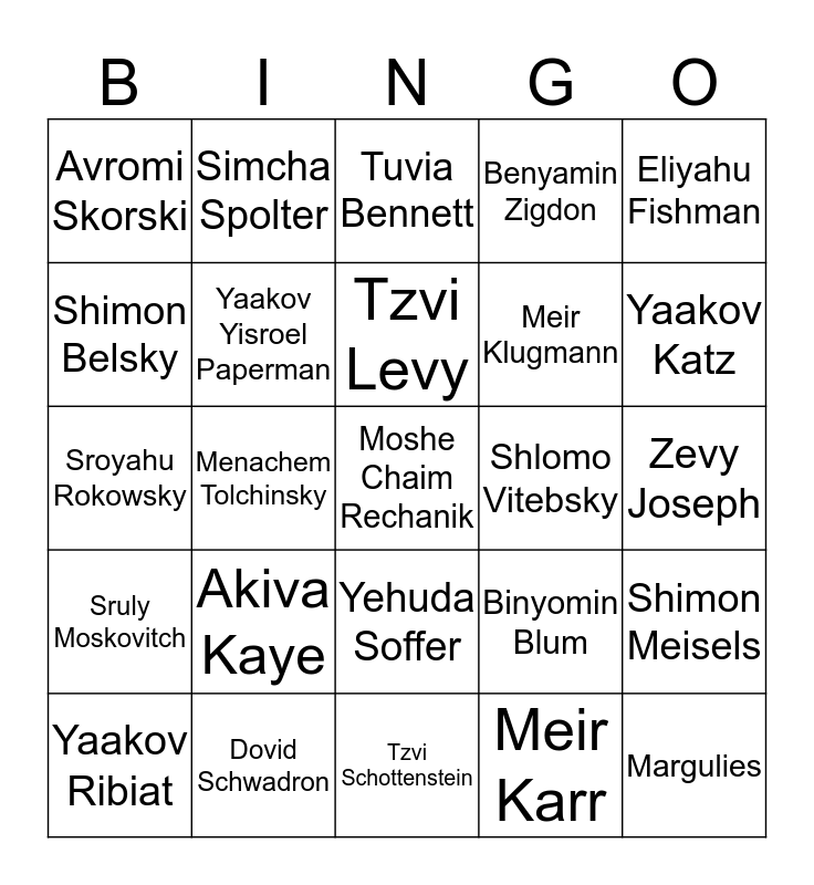 This bingo card has 164 words: Tzvi Aryeh Abramowitz, Meir Adler, Gavriel Adler, Shuey Aron, Yehuda Zev Aron, Yonason Aryeh Aron, Daniel Aviv, Zev Tuvia Bauman, Simcha Bauman, Shimon Yehuda Beer, Shimon Belsky, Yishai Bennett, Tuvia Bennett, Aryeh Block, Binyomin Blum, Yossi Borenstein, Nochum Bresler, Yehoshua Cohen, Moshe Cohen, Avromi Cohen, Eliyahu Cohen, Nochum Compton, Aaron Compton, Shauli Compton, Avraham Davis, Shlomo Diamond, Rafi Diamond, Dovid Yisroel Doria, Chaim Feifer, Levi Fertel, Zevi Fishbane, Chaim Ozer Fishman, Eliyahu Fishman, Sholom Fleisher, Chaim Tzvi Freedman, Avromi Freedman, Zev Garfunkel, Yosef Shalom Geberer, Nochum Tzvi Goldberg, Moshe Goldstein, Shlomo Noach Goldstein, Shlomo Goldstein, Yitzy Gonsky, Ami Gorelick, Shai Gottesman, Yitzy Graiser, Yehoshua Graiser, Gedalia Greenwald, Yehuda Gross, Zevy Heifitz, Bentzi Helman, Dovid Hoffman, Yisroel Hunger, Aryeh Leib Hunger, Yossi Jacobs, Binyomin Jacobs, Chaim OZer Jakobowitz (Dessler), Zevy Joseph, Baruch Yehua Joseph, Chaim Joseph, Meir Karr, Chaim Katz, Yaakov Katz, Shmuel Dovid Katz, Ari Katz, Akiva Kaye, Shraga Feivel Kirzner, Menachem Klein, Menachem Klein, Yaakov Klein, Kasriel Kletski, Meir Klugmann, Yechiel Aryeh Klugmann, Tzvi Yehuda Koval, Nachi Koyfman, Moishe Laskin, Chaim Levi Lebovits, Aryeh Lerman, Michael Lerman, Naftoli Levi, Mutty Levin, Tzvi Levy, Moishe Lubling, Chaim Mann, Meir Mann, Margulies, Margulies, Michoel Yosef Mayerfeld, Shimon Meisels, Sruly Moskovitch, Michoel Yosef Nadoff, Asher Nakdiman, Chaim Yisroel Nestlebaum, Chaim Nusbaum, Shmueli Nusbaum, Shmuel Yaakov Osherowitz, Yaakov Yisroel Paperman, Aaron Paperman, Doniel Perlstein, Eli Meir Rappaport, Asher Rechanik, Moshe Chaim Rechanik, Avraham Yeshaya Reich, Yekusiel Reich, Nosson Reiss, Dovid Aryeh Reiss, Mordechai Ribiat, Yaakov Ribiat, Sroyahu Rokowsky, Zalman Noach Rokowsky, Moshe Zev Rokowsky, Shlomo Rosner, Aharon Rotenberg, Moshe Rotenberg, Nosson Meir Rozen, Moshe Rozen, Yisroel Isser Scheinbaum, Yehoshua Dovid Scheinbaum, Noach Scheinbaum, Meir Simcha Scheinis, Tzvi Schottenstein, Zacharya Schulgasser, Achiezer Simcha Schulgasser, Dovid Schwadron, Yoel Seligman, Meir Shwartz, Boruch Sicker, Avromi Skorski, Dovid Skorski, Moshe Yosef Soffer, Yehuda Soffer, Yehuda Leib Soloman, Yaakov Spitz, Simcha Spolter, Avi Stein, Yeruchem Steinmetz, Dovid Aryeh Stelzer, Binyomin Stern, Tzvi Strauss, Shragie Strauss, Aharon Tenenbaum, Avraham Asher Tolchinsky, Mordechai Tolchinsky, Eliyahu Tolchinsky, Yaakov Tolchinsky, Menachem Tolchinsky, Yisroel Chaim Turner, Dovid Umansky, Shlomo Vitebsky, Shlomo Vitebsky, Asher Wolfson, Nate Wolfson, Chananel Yeganeh, Dovi Zidele, Yisroel Zidele, Benyamin Zigdon, Yosef Zigdon, Elie Zigdon, Shalom Zigdon, Pinchas Zigdon, Betzalel Zigun, Shlomo Zalman Zigun, Shlomo Zimberg and Yaakov Zimberg.
