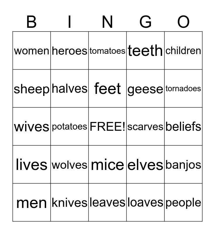 This bingo card has a free space and 24 words: wolves, knives, feet, men, children, women, sheep, heroes, scarves, mice, geese, wives, elves, banjos, halves, loaves, beliefs, tomatoes, tornadoes, potatoes, people, lives, teeth and leaves.