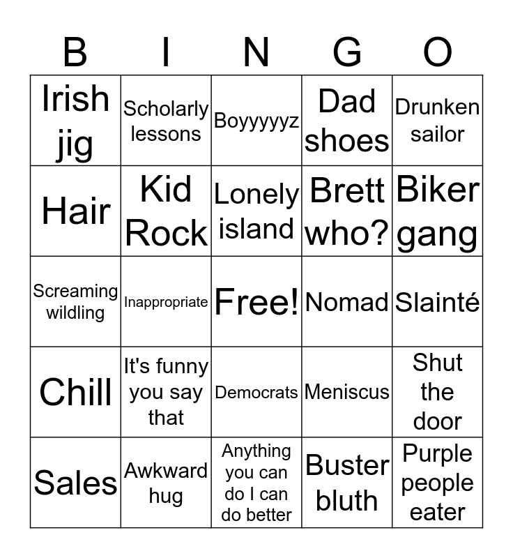 This bingo card has a free space and 24 words: It's funny you say that, Awkward hug, Lonely island, Sales, Drunken sailor, Irish jig, Hair, Scholarly lessons, Nomad, Democrats, Brett who?, Screaming wildling, Meniscus, Shut the door, Kid Rock, Buster bluth, Slainté, Boyyyyyz, Biker gang, Inappropriate, Purple people eater, Chill, Dad shoes and Anything you can do I can do better.