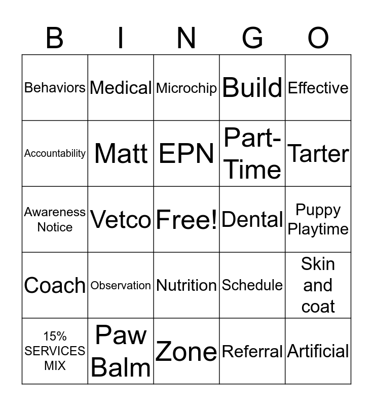 This bingo card has a free space and 24 words: Observation, Paw Balm, EPN, 15% SERVICES MIX, Effective, Behaviors, Accountability, Medical, Dental, Nutrition, Part-Time, Awareness Notice, Schedule, Skin and coat, Matt, Referral, Puppy Playtime, Microchip, Tarter, Vetco, Artificial, Coach, Build and Zone.