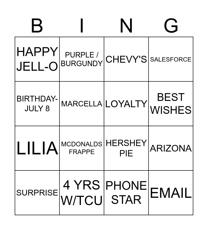 This bingo card has 20 words: ARIZONA, 49ERS, CHEVY'S, ATM/ILT, SURPRISE, BIRTHDAY-JULY 8, 4 YRS W/TCU, HAPPY JELL-O, LILIA, PURPLE / BURGUNDY, MCDONALDS FRAPPE, HERSHEY PIE, MARCELLA, EMAIL, LOYALTY, POT LUCK, BEST WISHES, SALESFORCE, PHONE STAR and BRINKS.