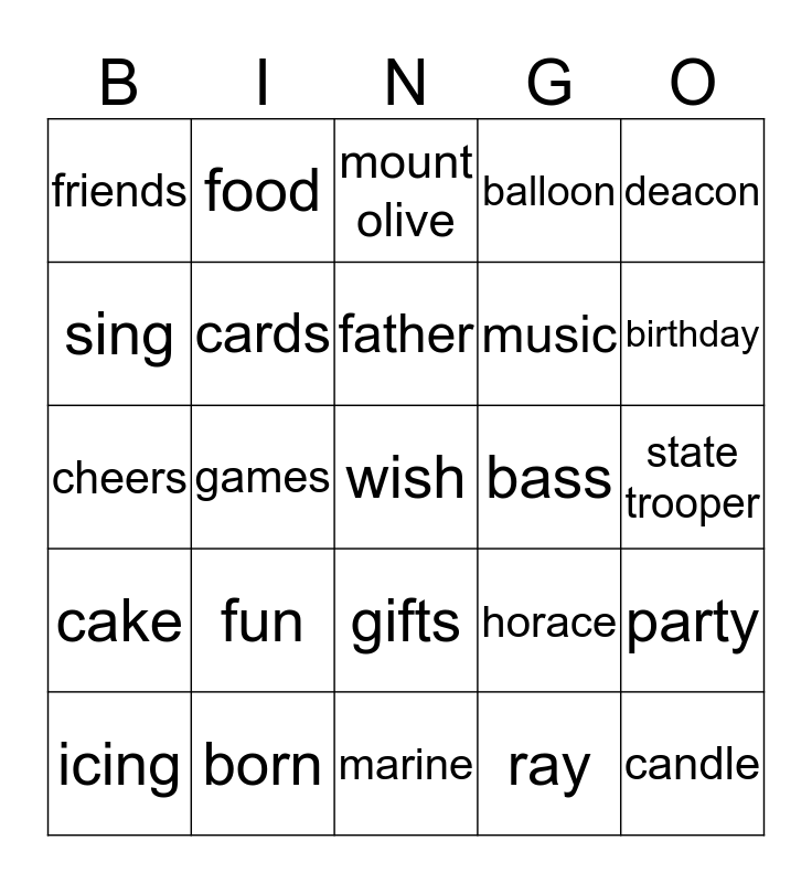 This bingo card has 25 words: fun, marine, father, icing, deacon, friends, sing, food, bass, gifts, music, cheers, horace, party, cards, candle, state trooper, mount olive, birthday, games, wish, born, cake, balloon and ray.