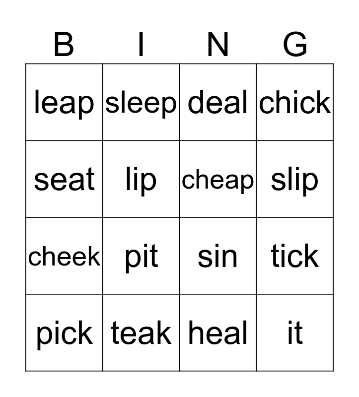 This bingo card has 32 words: eat, chip, tick, ship, it, cheap, seat, meal, sleep, sick, slip, deal, dill, sit, teak, sheep, mill, sin, seen, bin, bean, hill, heal, peek, pick, chick, cheek, lip, leap, pip, peep and pit.