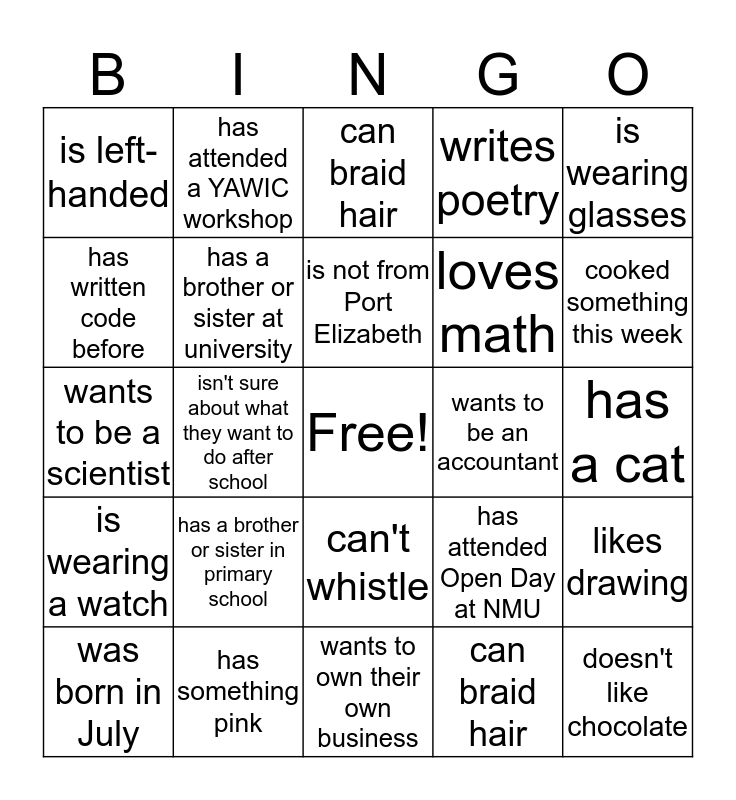 This bingo card has a free space and 24 words: was born in July, has a brother or sister in primary school, is not from Port Elizabeth, can braid hair, is wearing glasses, is left-handed, has attended a YAWIC workshop, can braid hair, wants to be an accountant, has a cat, wants to be a scientist, has a brother or sister at university, has attended Open Day at NMU, likes drawing, has written code before, has something pink, wants to own their own business, writes poetry, cooked something this week, is wearing a watch, isn't sure about what they want to do after school, can't whistle, loves math and doesn't like chocolate.