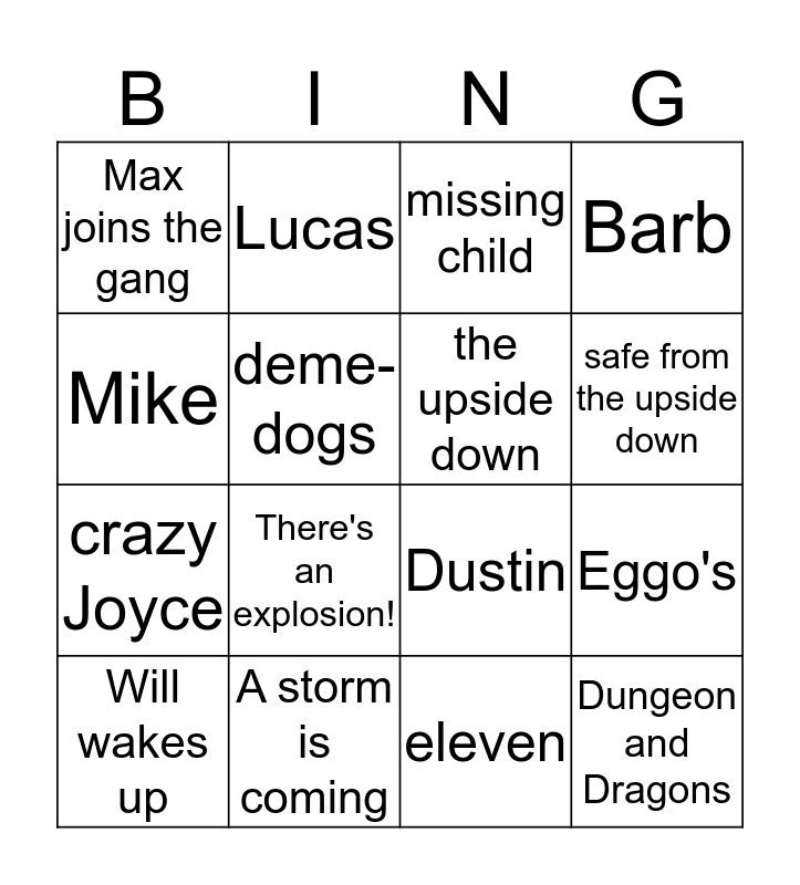 This bingo card has 17 words: eleven, Will wakes up, missing child, Max joins the gang, There's an explosion!, Barb, Eggo's, the upside down, safe from the upside down, deme-dogs, A storm is coming, Dustin, Mike, Lucas, crazy Joyce, Will and Dungeon and Dragons.