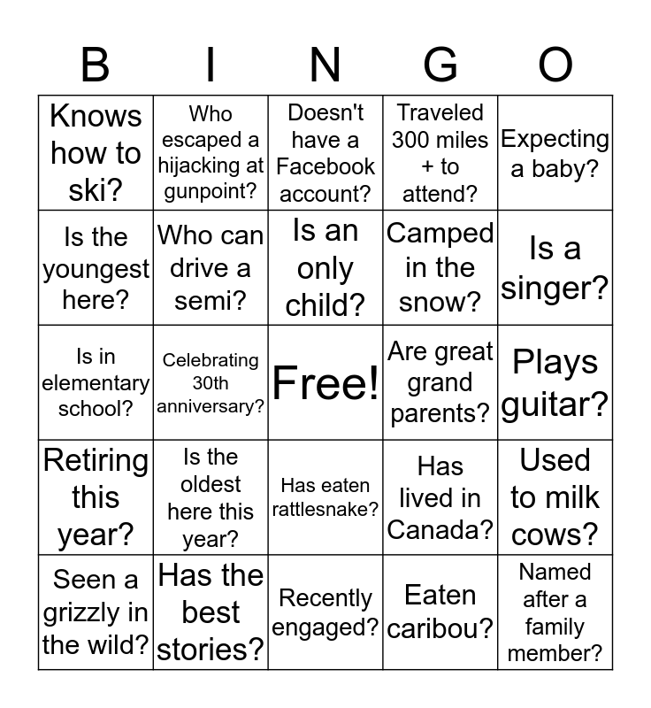 This bingo card has a free space and 24 words: Is the oldest here this year?, Has the best stories?, Is an only child?, Seen a grizzly in the wild?, Expecting a baby?, Knows how to ski?, Is the youngest here?, Who escaped a hijacking at gunpoint?, Are great grand parents?, Has eaten rattlesnake?, Camped in the snow?, Is in elementary school?, Has lived in Canada?, Used to milk cows?, Who can drive a semi?, Eaten caribou?, Plays guitar?, Doesn't have a Facebook account?, Is a singer?, Celebrating 30th anniversary?, Named after a family member?, Retiring this year?, Traveled 300 miles + to attend? and Recently engaged?.