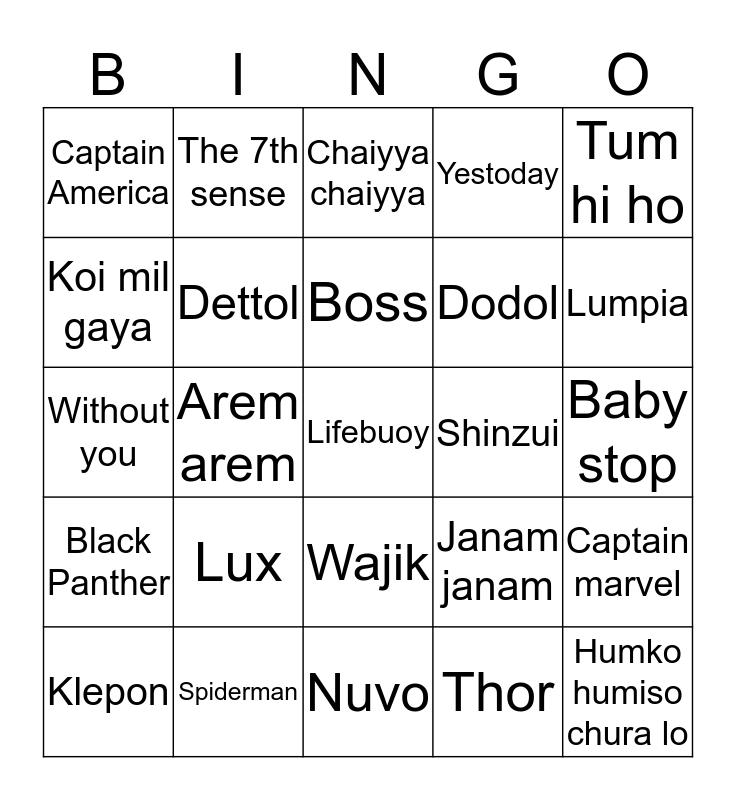 This bingo card has a free space and 24 words: Lux, Spiderman, Boss, Klepon, Tum hi ho, Captain America, Koi mil gaya, The 7th sense, Shinzui, Wajik, Dodol, Without you, Janam janam, Captain marvel, Dettol, Thor, Baby stop, Chaiyya chaiyya, Lumpia, Arem arem, Humko humiso chura lo, Black Panther, Yestoday and Nuvo.