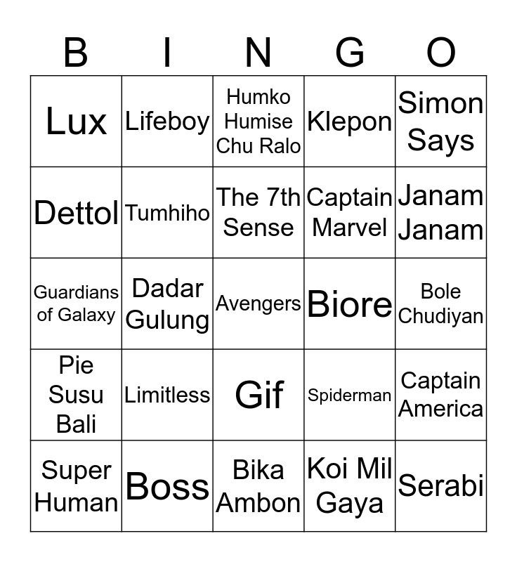 This bingo card has a free space and 24 words: Limitless, Boss, The 7th Sense, Super Human, Simon Says, Lux, Dettol, Lifeboy, Biore, Gif, Captain Marvel, Guardians of Galaxy, Spiderman, Captain America, Tumhiho, Koi Mil Gaya, Bole Chudiyan, Humko Humise Chu Ralo, Janam Janam, Dadar Gulung, Serabi, Pie Susu Bali, Klepon and Bika Ambon.