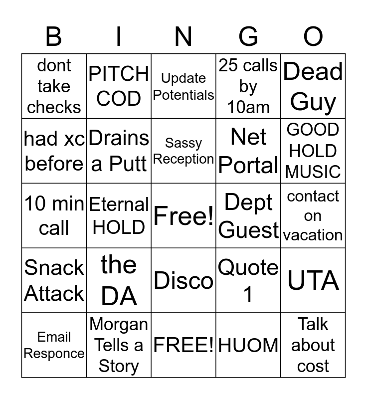 This bingo card has a free space and 24 words: the DA, Morgan Tells a Story, Sassy Reception, Email Responce, Dead Guy, dont take checks, had xc before, PITCH COD, Dept Guest, Disco, Net Portal, 10 min call, Quote 1, UTA, Drains a Putt, HUOM, contact on vacation, Update Potentials, GOOD HOLD MUSIC, Eternal HOLD, Talk about cost, Snack Attack, 25 calls by 10am and FREE!.