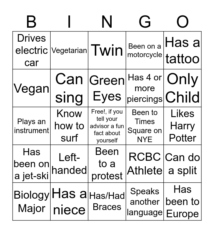 This bingo card has a free space and 29 words: Has been to Disney, Has a niece, Twin, Can Braid, Has a tattoo, Drives electric car, Can sing, Green Eyes, Been to Times Square on NYE, Can do a split, Biology Major, Know how to surf, Speaks another language, Has been to Europe, Plays an instrument, Has 5 or more siblings, Has/Had Braces, RCBC Athlete, Only Child, Has been on a jet-ski, Left-handed, Has cut school, Has 4 or more piercings, Likes Harry Potter, Vegan, Vegetarian, Been to a protest, Been on a motorcycle and Has a pet.