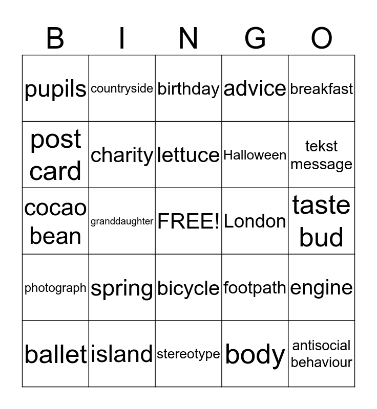 This bingo card has a free space and 24 words: spring, island, lettuce, ballet, breakfast, pupils, post card, countryside, London, bicycle, Halloween, cocao bean, footpath, engine, charity, body, taste bud, birthday, tekst message, granddaughter, antisocial behaviour, photograph, advice and stereotype.