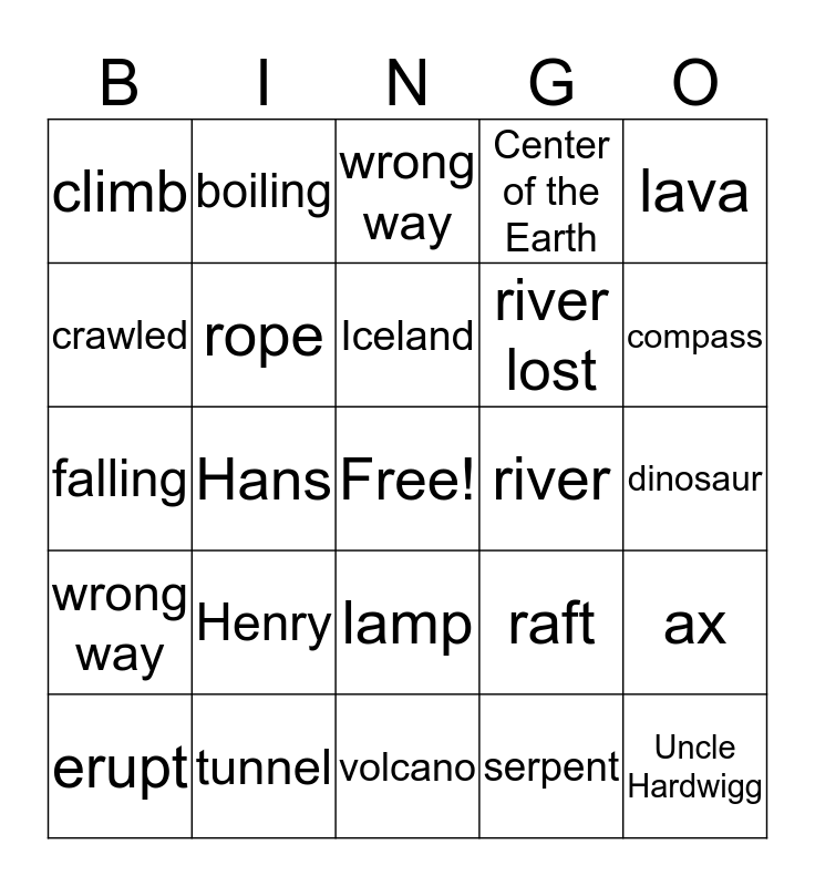 This bingo card has a free space and 24 words: Henry, tunnel, Iceland, erupt, lava, climb, crawled, boiling, river, lamp, river lost, falling, raft, ax, rope, serpent, dinosaur, wrong way, compass, Hans, Uncle Hardwigg, wrong way, Center of the Earth and volcano.