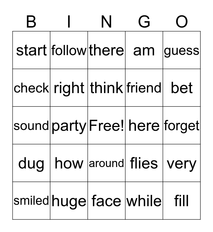 This bingo card has a free space and 24 words: how, huge, think, smiled, guess, start, check, follow, here, around, friend, sound, flies, very, right, while, forget, there, bet, party, fill, dug, am and face.