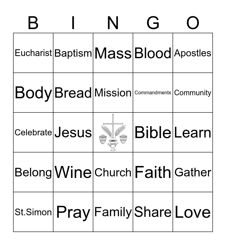 This bingo card has a free space and 29 words: St.Simon, friends, Jesus, 3rd Grade, Eucharist, Mass, Bread, Wine, Bible, Pray, Learn, Love, Family, Share, Community, Parish, Church, Belong, Apostles, Celebrate, Faith, Sacraments, Commandments, Body, Blood, Baptism, Gather, Mission and Holy Spirit.