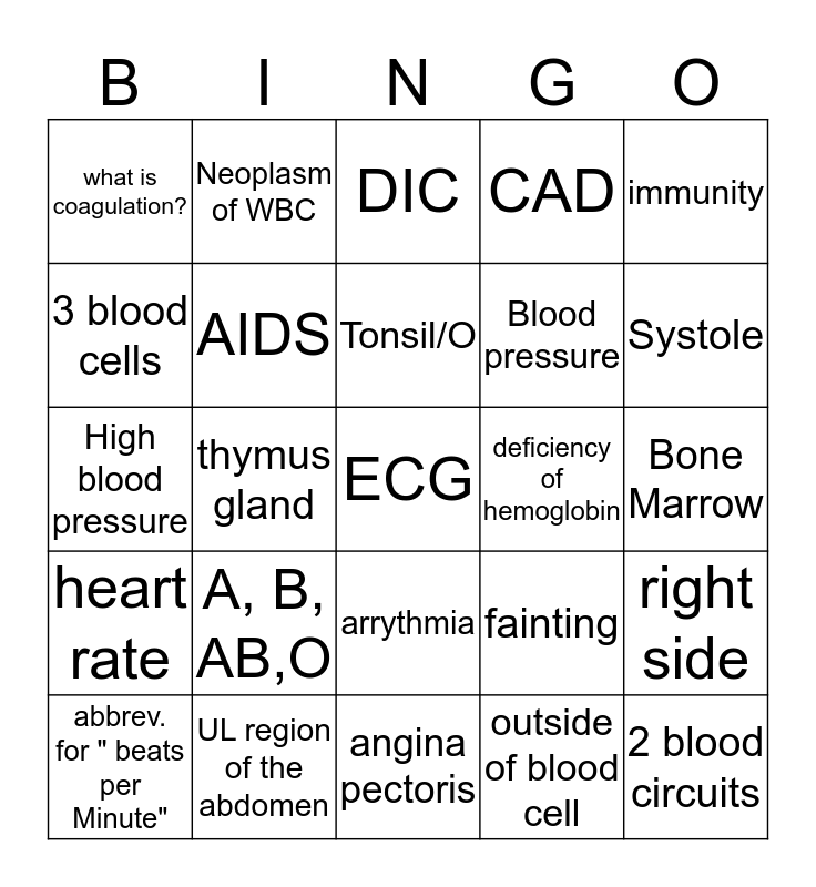 This bingo card has a free space and 24 words: A, B, AB,O, UL region of the abdomen, Tonsil/O, abbrev. for " beats per Minute", immunity, what is coagulation?, 3 blood cells, Neoplasm of WBC, deficiency of hemoglobin, arrythmia, Blood pressure, High blood pressure, fainting, right side, AIDS, outside of blood cell, Bone Marrow, DIC, Systole, thymus gland, 2 blood circuits, heart rate, CAD and angina pectoris.