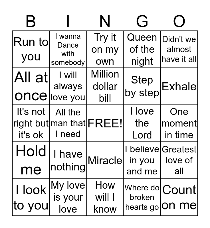 This bingo card has a free space and 24 words: I have nothing, My love is your love, Million dollar bill, I look to you, Didn't we almost have it all, Run to you, All at once, I wanna Dance with somebody, I love the Lord, Miracle, Step by step, It's not right but it's ok, I believe in you and me, Greatest love of all, I will always love you, Where do broken hearts go, One moment in time, Try it on my own, Exhale, All the man that I need, Count on me, Hold me, Queen of the night and How will I know.