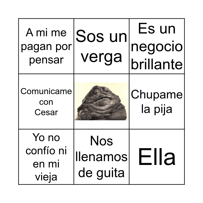 This bingo card has a free space and 8 words: Chupame la pija, Es un negocio brillante, Sos un verga, Yo no confío ni en mi vieja, A mi me pagan por pensar, Ella, Comunicame con Cesar and Nos llenamos de guita.
