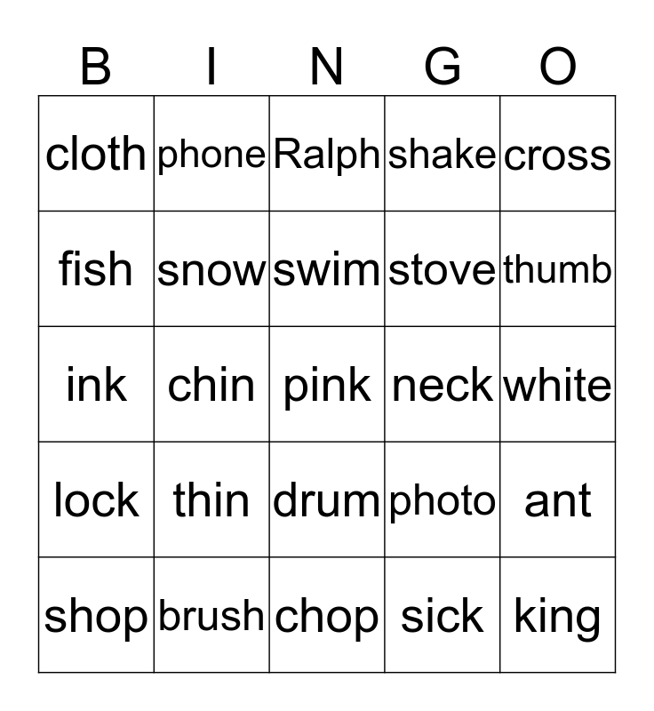 This bingo card has 27 words: photo, king, stove, chop, fish, Ralph, phone, lock, neck, ant, ink, shake, shop, brush, thumb, sing, snow, swim, thin, cloth, white, sick, chin, pink, drum, cross and frog.