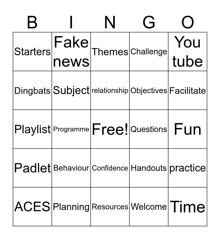 This bingo card has a free space and 29 words: ACES, Reflection, Programme, Social Media, Starters, Themes, Subject, Behaviour, Questions, Planning, Fun, Time, Resources, Welcome, Facilitate, Body Language, Confidence, Padlet, You tube, Playlist, Handouts, Aims, Objectives, Dingbats, Challenge, Fake news, practice, relationship and register.
