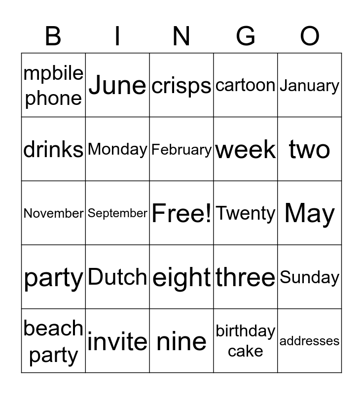 This bingo card has a free space and 62 words: fun, invite, birthday, party, invitation card, tomorrow, Monday, Thuesday, week, name, cartoon, teacher, drinks, sweets, balloons, mpbile phone, addresses, January, one, February, Twenty, crisps, beach party, birthday cake, Wednes-day, Thursday, Friday, Saturday, Sunday, farewell party, beach party, ice-cream, March, April, May, June, July, August, September, October, November, December, Dutch, one, two, three, four, five, six, seven, eight, nine, ten, eleven, twelve, thirthteen, fourteen, fifteen, sixteen, seventeen, eightteen and twenty.