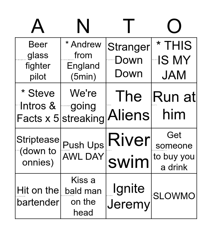 This bingo card has 16 images and 16 words: Kiss a bald man on the head, Get someone to buy you a drink, Stranger Down Down, Beer glass fighter pilot, Striptease (down to onnies), * Andrew from England (5min), River swim, Ignite Jeremy, * Steve Intros & Facts x 5, We're going streaking, Hit on the bartender, * THIS IS MY JAM, Push Ups AWL DAY, Run at him, The Aliens and SLOWMO.