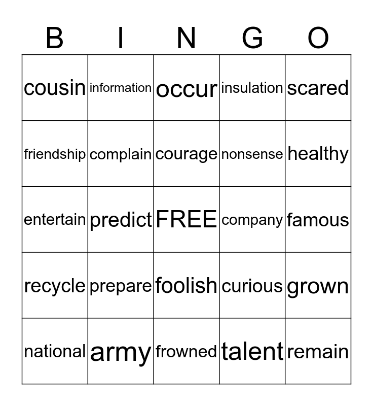 This bingo card has a free space and 24 words: prepare, army, courage, national, scared, cousin, friendship, information, company, foolish, nonsense, entertain, curious, grown, complain, talent, famous, occur, healthy, predict, remain, recycle, insulation and frowned.
