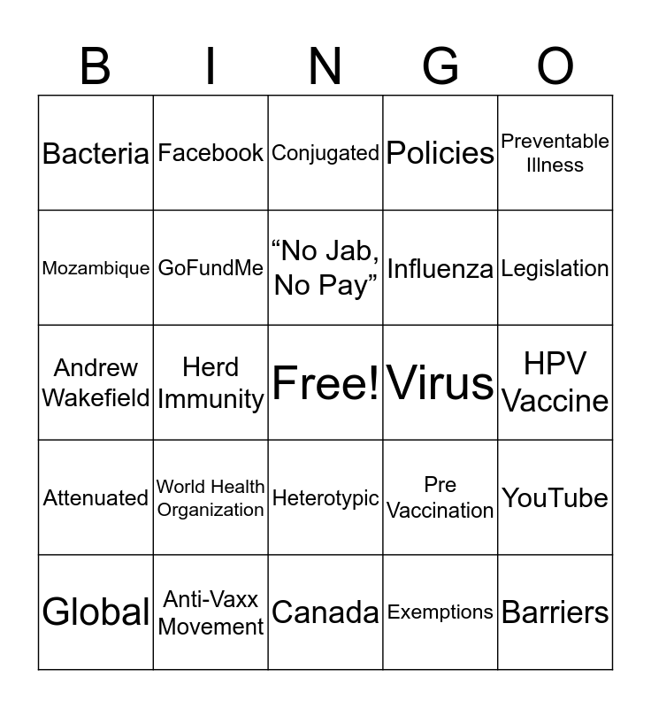 This bingo card has a free space and 37 words: Jenny McCarthy, Facebook, Hasidic, GoFundMe, YouTube, World Health Organization, “No Jab, No Pay”, Polio, Preventable Illness, Vaccine, Herd Immunity, Policies, Barriers, HPV Vaccine, Mozambique, Attenuated, Vaccine Hesitancy, Conjugated, Heterotypic, Virus, Bacteria, Legislation, Global, Canada, Mandatory, Exemptions, Facebook, Autism, The Press, News Literacy Project, Privilege, Anti-Vaxx Movement, Andrew Wakefield, Revoked, Pre Vaccination, Influenza and Measles.