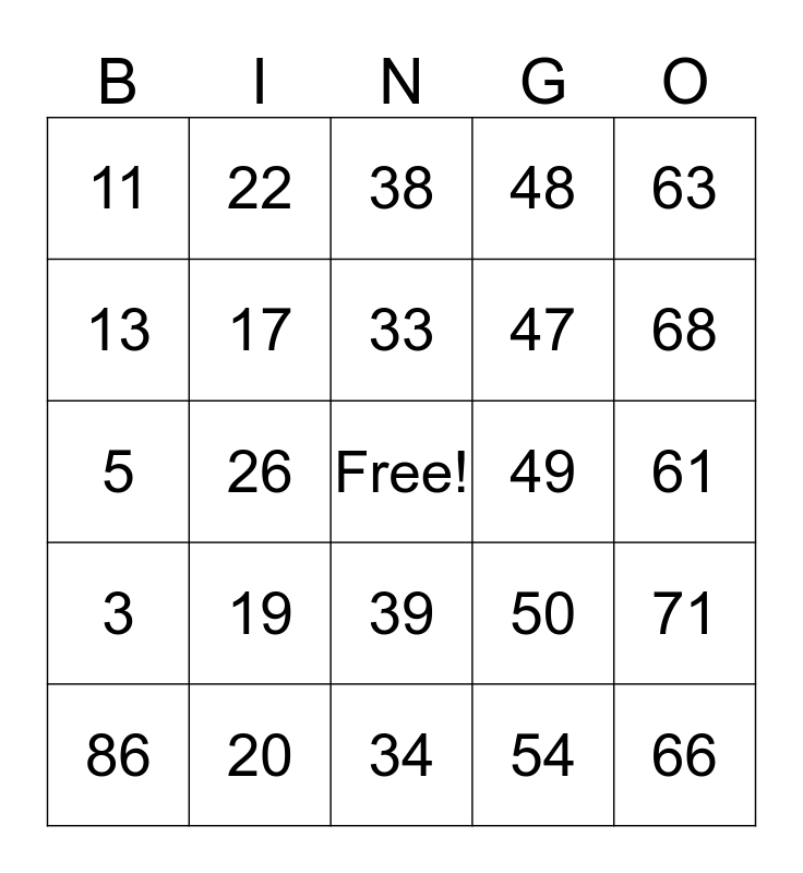 This bingo card has a free space and 69 words: 1, 16, 31, 46, 61, 2, 17, 32, 47, 62, 3, 18, 48, 63, 4, 19, 33, 49, 64, 5, 20, 34, 50, 65, 100, 21, 35, 51, 66, 7, 22, 36, 75, 67, 60, 23, 37, 53, 68, 86, 24, 38, 54, 69, 10, 25, 39, 55, 97, 11, 26, 40, 56, 71, 45, 27, 44, 57, 72, 13, 28, 89, 58, 73, 14, 29, 43, 59 and 74.