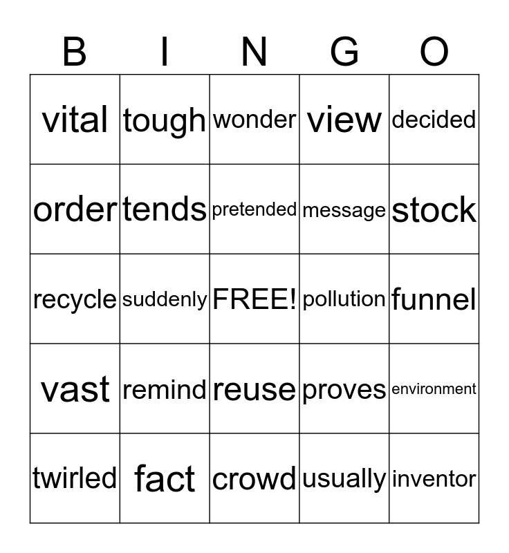 This bingo card has a free space and 24 words: remind, fact, pretended, twirled, decided, vital, order, tough, pollution, reuse, message, recycle, proves, environment, tends, usually, funnel, wonder, stock, suddenly, inventor, vast, view and crowd.