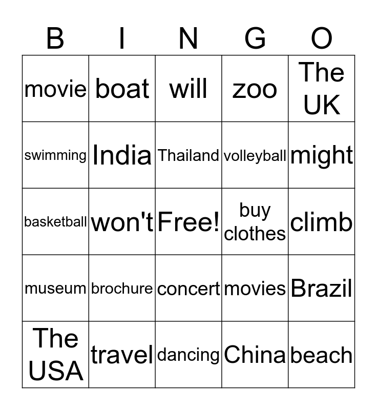 This bingo card has a free space and 24 words: brochure, travel, Thailand, The USA, The UK, movie, swimming, boat, buy clothes, concert, volleyball, basketball, movies, Brazil, India, China, climb, will, might, won't, beach, museum, zoo and dancing.