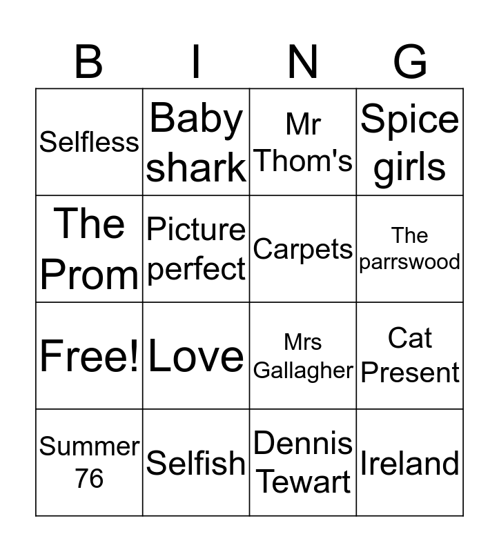 This bingo card has 20 words: Cat Present, Shared underpants, Mr Thom's, Too many cocktails, Summer 76, The Prom, Selfish, Selfless, Free!, Baby shark, Love, Mrs Gallagher, Picture perfect, Ireland, Carpets, B&Q, The parrswood, Spice girls, Dennis Tewart and Emotional.