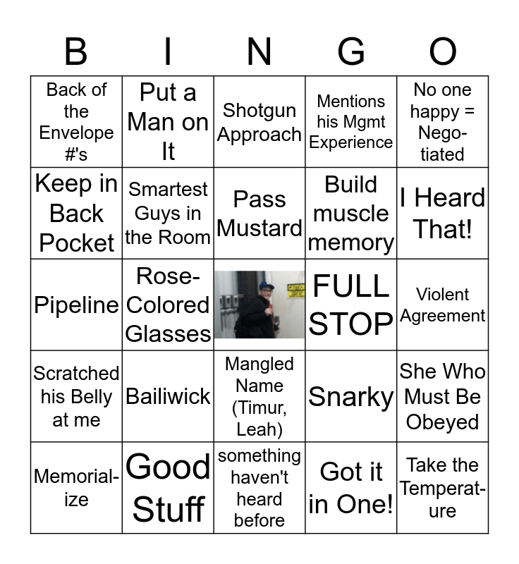This bingo card has a free space and 24 words: Bailiwick, Good Stuff, Pass Mustard, Memorial- ize, No one happy = Nego-tiated, Back of the Envelope #'s, Keep in Back Pocket, Put a Man on It, FULL STOP, Mangled Name (Timur, Leah), Build muscle memory, Pipeline, Snarky, She Who Must Be Obeyed, Smartest Guys in the Room, Got it in One!, Violent Agreement, Shotgun Approach, I Heard That!, Rose-Colored Glasses, Take the Temperat- ure, Scratched his Belly at me, Mentions his Mgmt Experience and something haven't heard before.