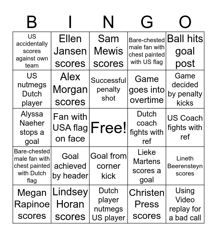 This bingo card has a free space and 39 words: Red card, Yellow card, Offsides, Alex Morgan scores, Megan Rapinoe scores, Goal from corner kick, Successful penalty shot, Penalty shot, Ball hits goal post, Bare-chested male fan with chest painted with Dutch flag, Fan with USA flag on face, Bare-chested male fan with chest painted with US flag, Using Video replay for a bad call, US Coach fights with ref, Dutch coach fights with ref, Goal achieved by header, Goal from outside the box, US accidentally scores against own team, Dutch accidentally scores against own team, Lieke Martens scores a goal, US nutmegs Dutch player, Dutch player nutmegs US player, Game goes into overtime, Game decided by penalty kicks, Hand ball, Vivianne Miedema scores, Tobin Heath scores, Rose Lavelle scores, Carli Lloyd scores, Ellen Jansen scores, Rebate Jansen scores, Julie Ertz scores, Sam Mewis scores, Lindsey Horan scores, Christen Press scores, Shanice van de Sanden scores, Lineth Beerensteyn scores, Alyssa Naeher stops a goal and Sari van Veenendaal stops a goal.