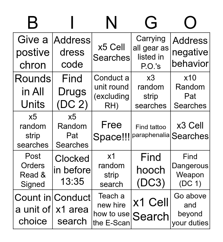 This bingo card has a free space and 24 words: Clocked in before 13:35, Conduct x1 area search, Conduct a unit round (excluding RH), Count in a unit of choice, Address negative behavior, Give a postive chron, Rounds in All Units, Address dress code, Find tattoo paraphenalia, x1 random strip search, x3 random strip searches, x5 random strip searches, Find hooch (DC3), Find Dangerous Weapon (DC 1), Find Drugs (DC 2), x1 Cell Search, x3 Cell Searches, x5 Cell Searches, x10 Random Pat Searches, x5 Random Pat Searches, Go above and beyond your duties, Post Orders Read & Signed, Carrying all gear as listed in P.O.'s and Teach a new hire how to use the E-Scan.