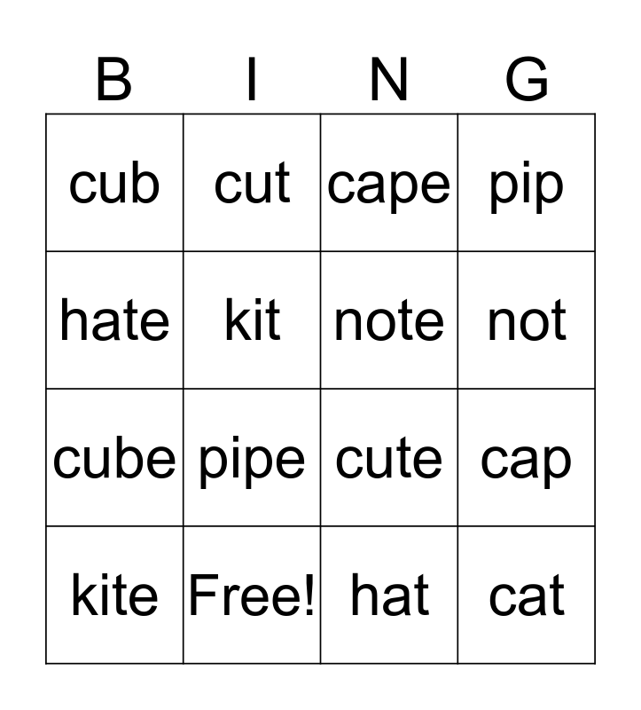 This bingo card has 16 words: Free!, cap, cape, cub, cube, cut, cute, hat, hate, kit, kite, pip, pipe, not, note and cat.