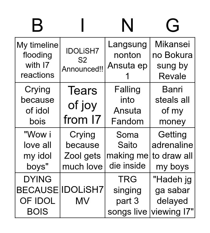 This bingo card has 16 words: IDOLiSH7 MV, Getting adrenaline to draw all my boys, Langsung nonton Ansuta ep 1, My timeline flooding with I7 reactions, "Wow i love all my idol boys", IDOLiSH7 S2 Announced!!, Soma Saito making me die inside, TRG singing part 3 songs live, Crying because of idol bois, Tears of joy from I7, DYING BECAUSE OF IDOL BOIS, Mikansei no Bokura sung by Revale, Crying because Zool gets much love, Banri steals all of my money, Falling into Ansuta Fandom and "Hadeh jg ga sabar delayed viewing I7".