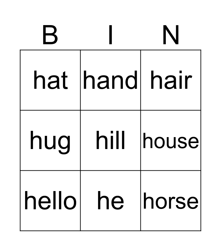This bingo card has a free space and 8 words: house, hair, hand, hello, hat, horse, hug and he.