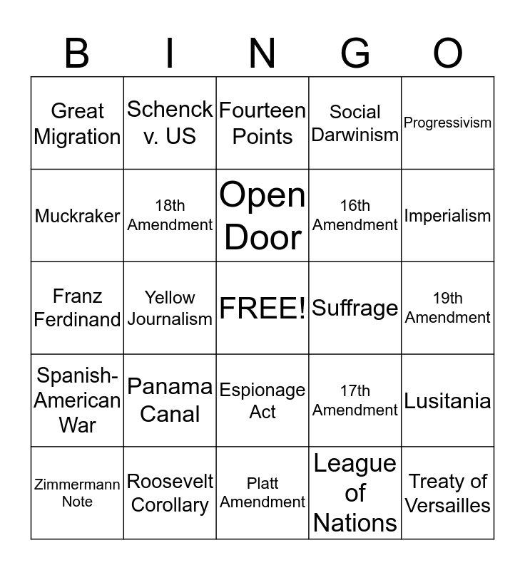 This bingo card has a free space and 24 words: Panama Canal, Roosevelt Corollary, Open Door, Zimmermann Note, Progressivism, Great Migration, Muckraker, Schenck v. US, Suffrage, Espionage Act, 16th Amendment, Franz Ferdinand, 17th Amendment, Lusitania, 18th Amendment, League of Nations, 19th Amendment, Fourteen Points, Imperialism, Yellow Journalism, Treaty of Versailles, Spanish-American War, Social Darwinism and Platt Amendment.