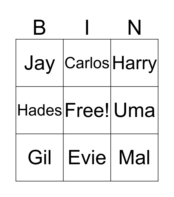 This bingo card has a free space and 8 words: Hades, Carlos, Uma, Gil, Harry, Jay, Evie and Mal.