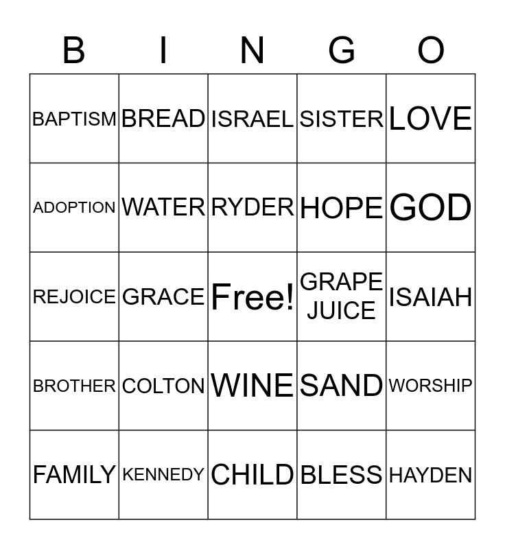 This bingo card has a free space and 24 words: COLTON, KENNEDY, RYDER, FAMILY, LOVE, BAPTISM, ADOPTION, BREAD, GRAPE JUICE, WINE, HOPE, REJOICE, SAND, WORSHIP, WATER, BLESS, ISAIAH, ISRAEL, GOD, GRACE, HAYDEN, BROTHER, SISTER and CHILD.