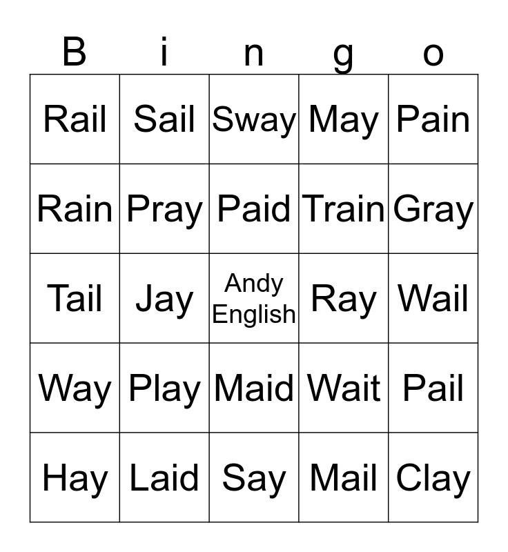 This bingo card has a free space and 26 words: Maid, Mail, Paid, Laid, Pain, Rail, Rain, Sail, Wail, Wait, Train, Tail, Pail, Hay, Jay, Lay, May, Way, Sway, Clay, Gray, Say, Ray, Play, Pray and Pay.