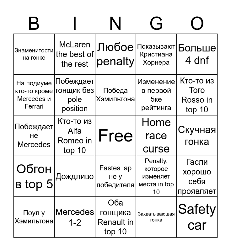 This bingo card has a free space and 24 words: Дождливо, Mercedes 1-2, Победа Хэмильтона, Поул у Хэмильтона, Больше 4 dnf, Знаменитости на гонке, На подиуме кто-то кроме Mercedes и Ferrari, McLaren the best of the rest, Home race curse, Fastes lap не у победителя, Изменение в первой 5ке рейтинга, Побеждает не Mercedes, Penalty, которое изменяет места in top 10, Гасли хорошо себя проявляет, Побеждает гонщик без pole position, Захватывающая гонка, Cкучная гонка, Любое penalty, Кто-то из Toro Rosso in top 10, Кто-то из Alfa Romeo in top 10, Safety car, Обгон в top 5, Показывают Кристиана Хорнера and Оба гонщика Renault in top 10.